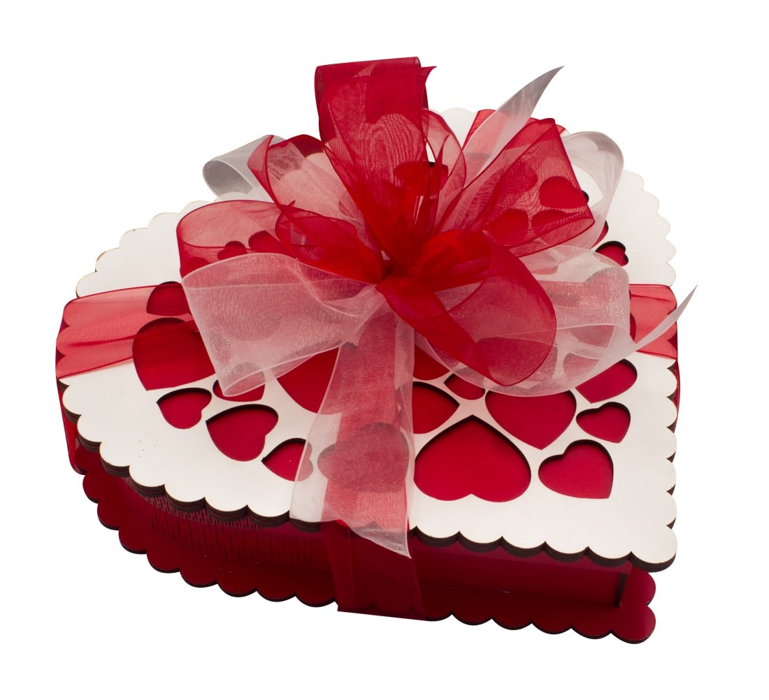Kutu üzerinde (Kapağında): Ahşap üzeri lazer ile işlenmiş kalp deseni, kırmızı beyaz tülü zarif süslemesiyle eşsiz sevgili hediyesi.