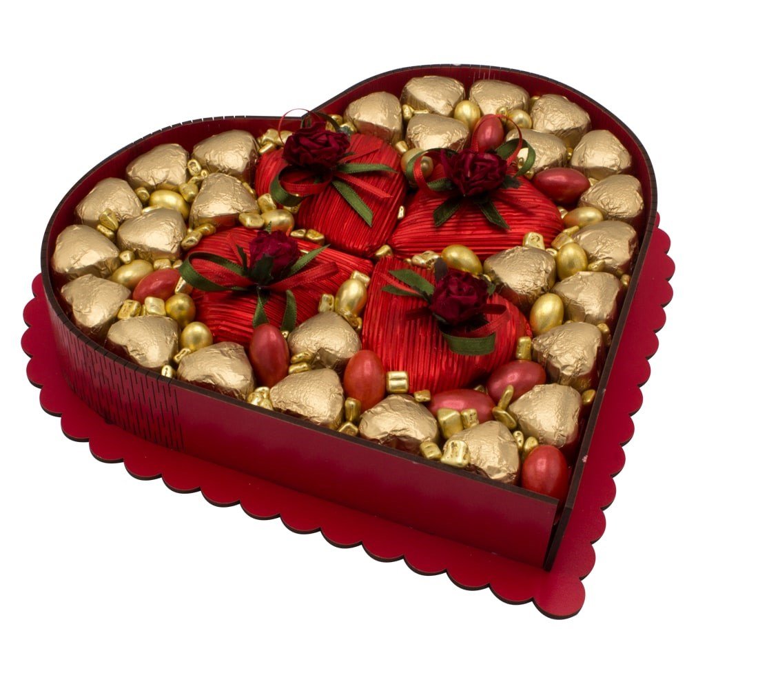 Kalpli Ahşap Kutulu Çikolatalarımız; dekorlu kalpli çikolata, altın yaldızlı çikolata ve altın çakıl taşı ve badem drajeler ile özel olarak hazırlanır…